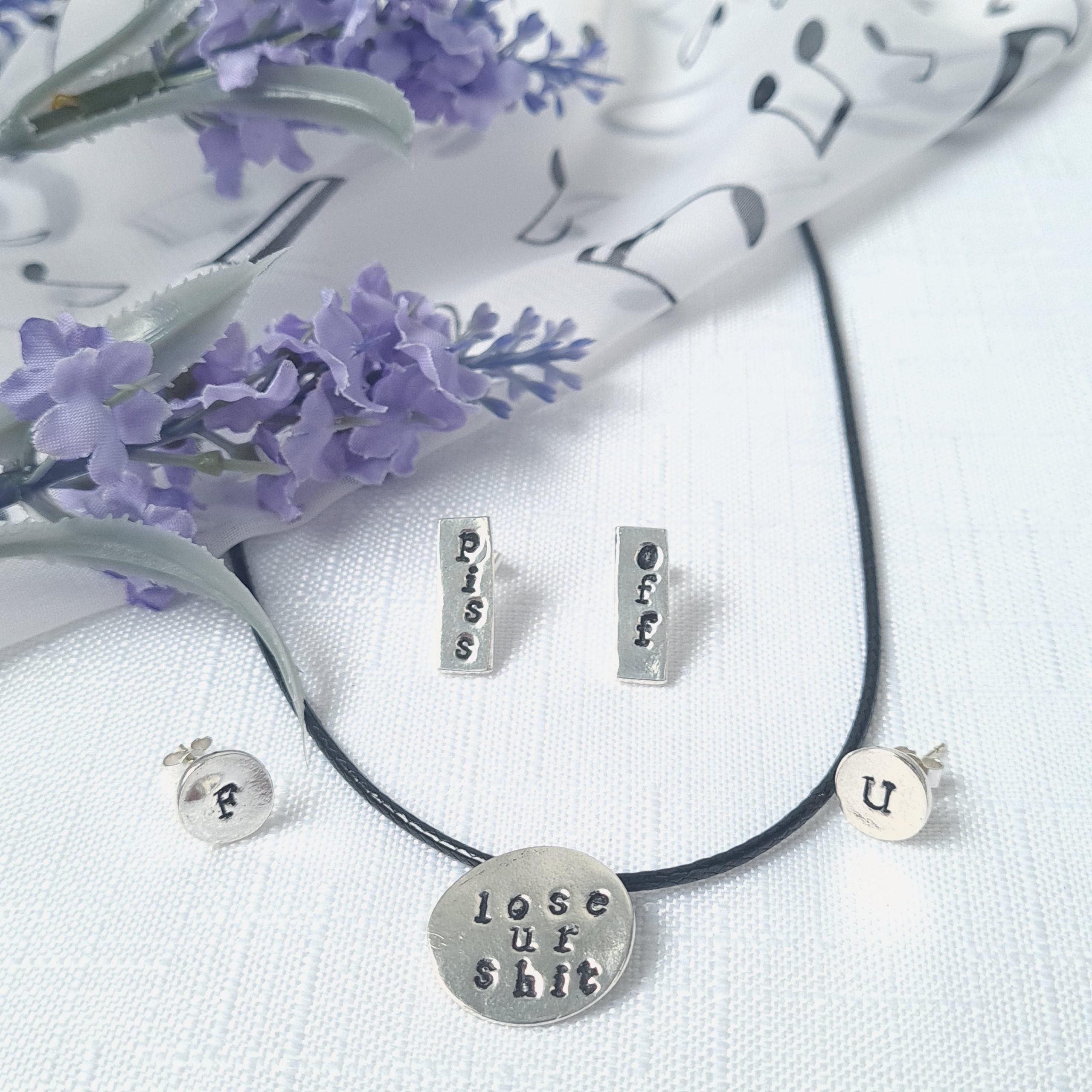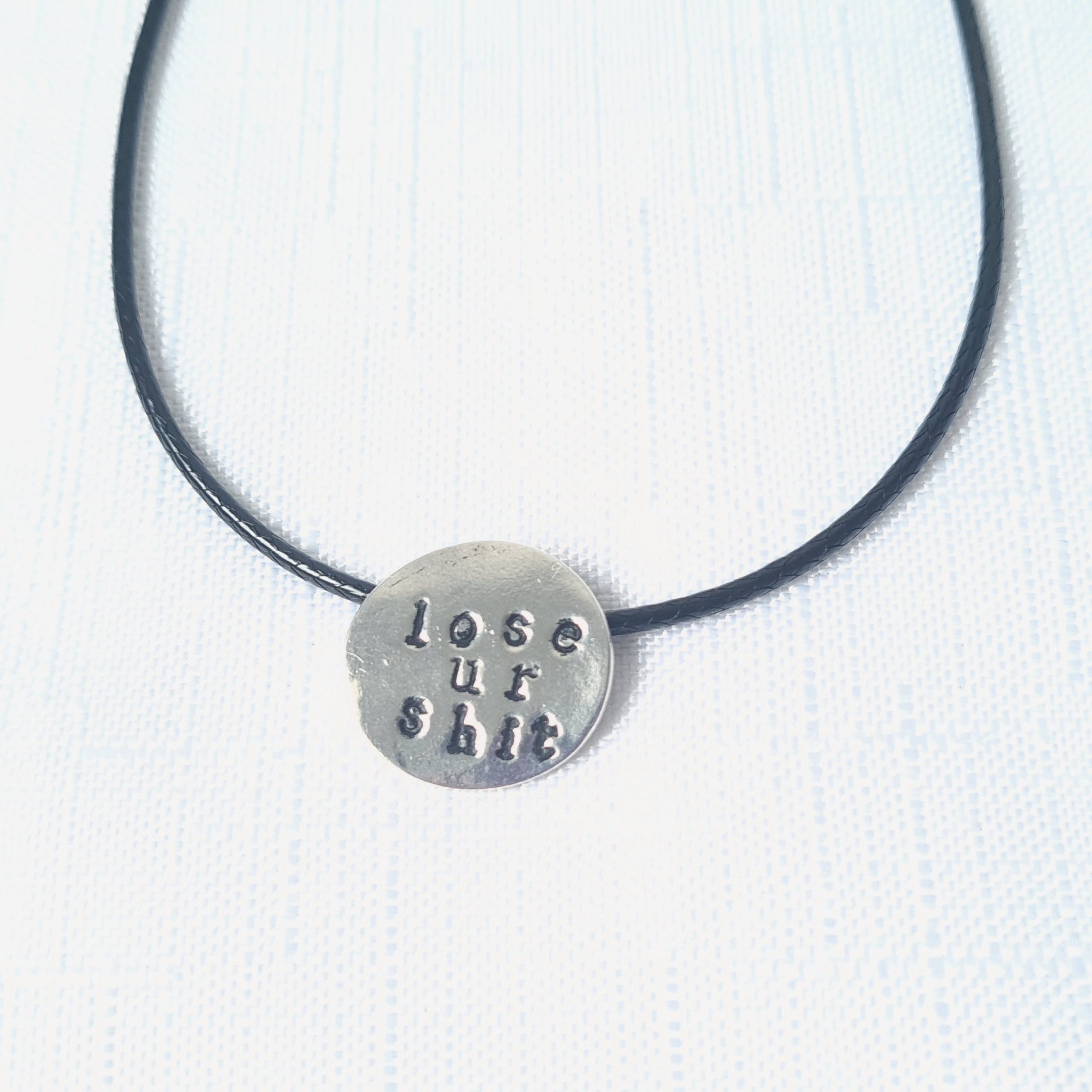 This simple silver clay pendant is hand stamped with the affirmation of “loose your shit”.