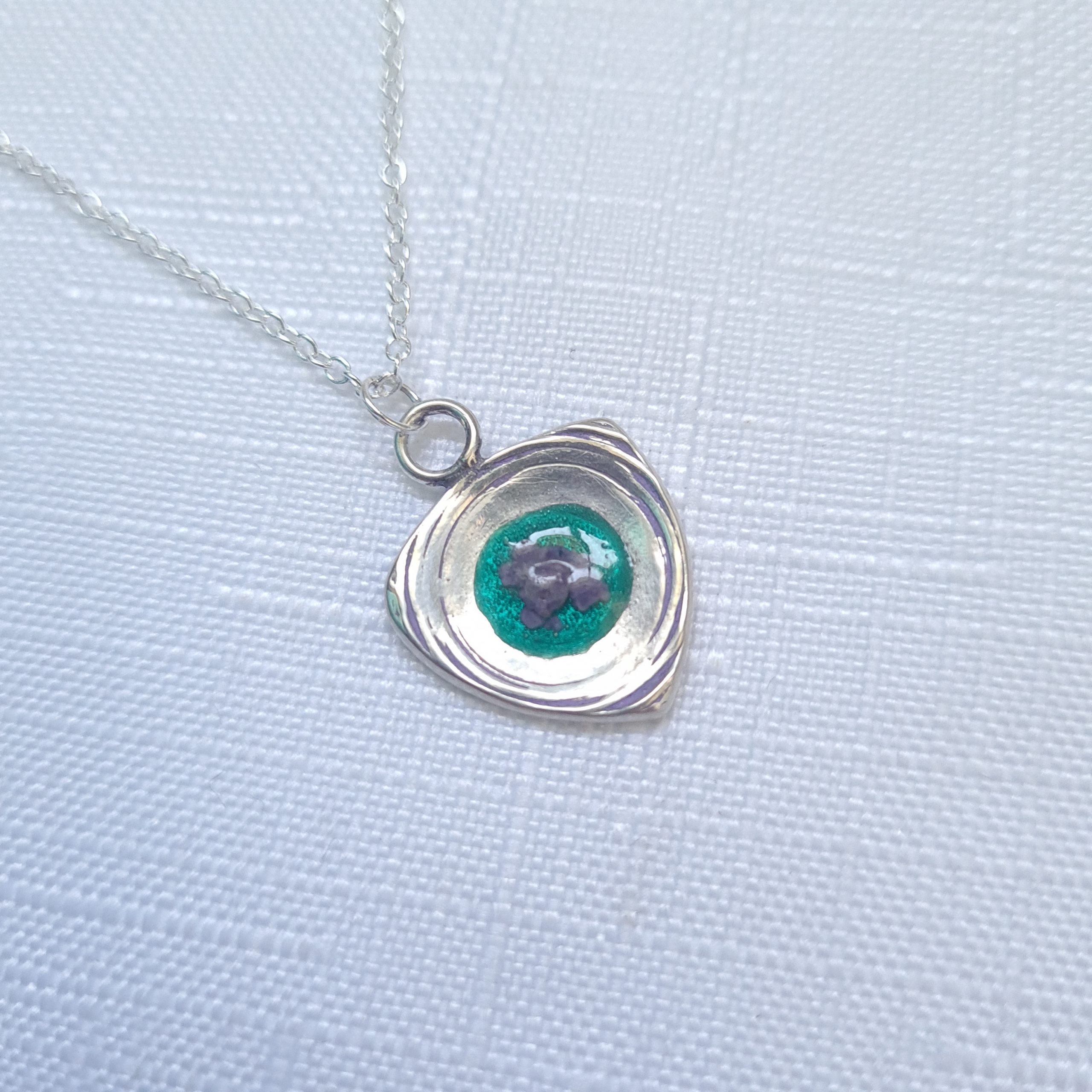 This delicate silver pendant has been handcrafted using silver clay, with enamel transparent green and a centre of opaque purple. It also has an inlay of purple gilders wax found the edging.